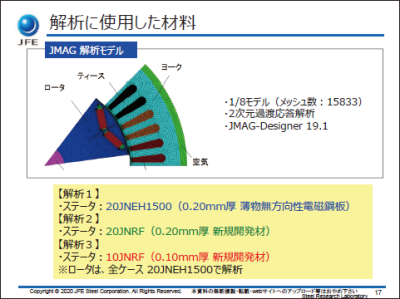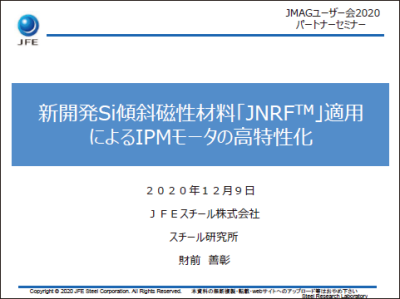 本講演では、新規材料「JNRF」をIPMモータに適用した際のモータ効率解析結果について報告します。